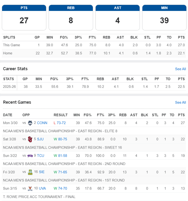 在NCCA疯狂三月精英八强赛中,卡梅隆-布泽尔全场比赛39分钟,21中10,三分4中1,拿到27分8篮板4助攻4失误2盖帽,命中率47.6%。但杜克大学在终场前6.5秒领先2分还手握球权的情况下,卡梅隆的弟弟凯登传球失误,最终康大的马林斯超远三分绝杀。